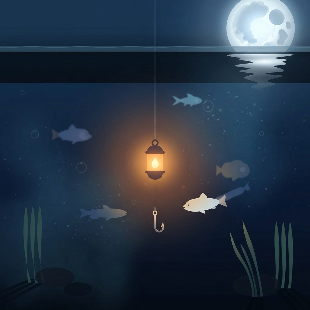 Hold to drop the lantern lure, release to reel it back, and catch the leftmost fish shown in the order strip. The next fish has to match exactly; a wrong fish or snag costs 1 knot and resets the order, while landing all 3 fish in sequence scores big and repairs 1 knot. Lose all 4 knots and the lake wins.
