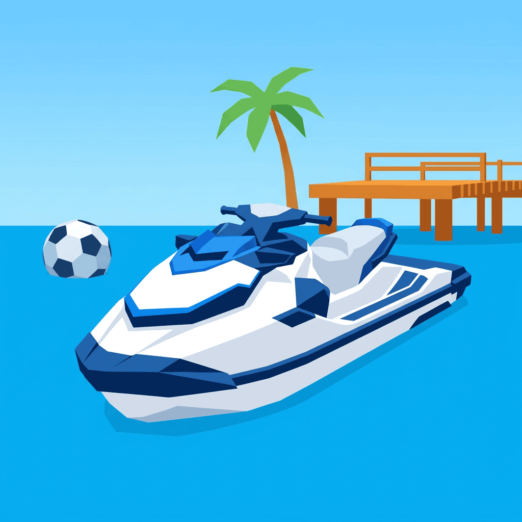 A bright arcade jet ski sandbox with checkpoints, jumps, and turbo boosts across a low-poly waterfront.